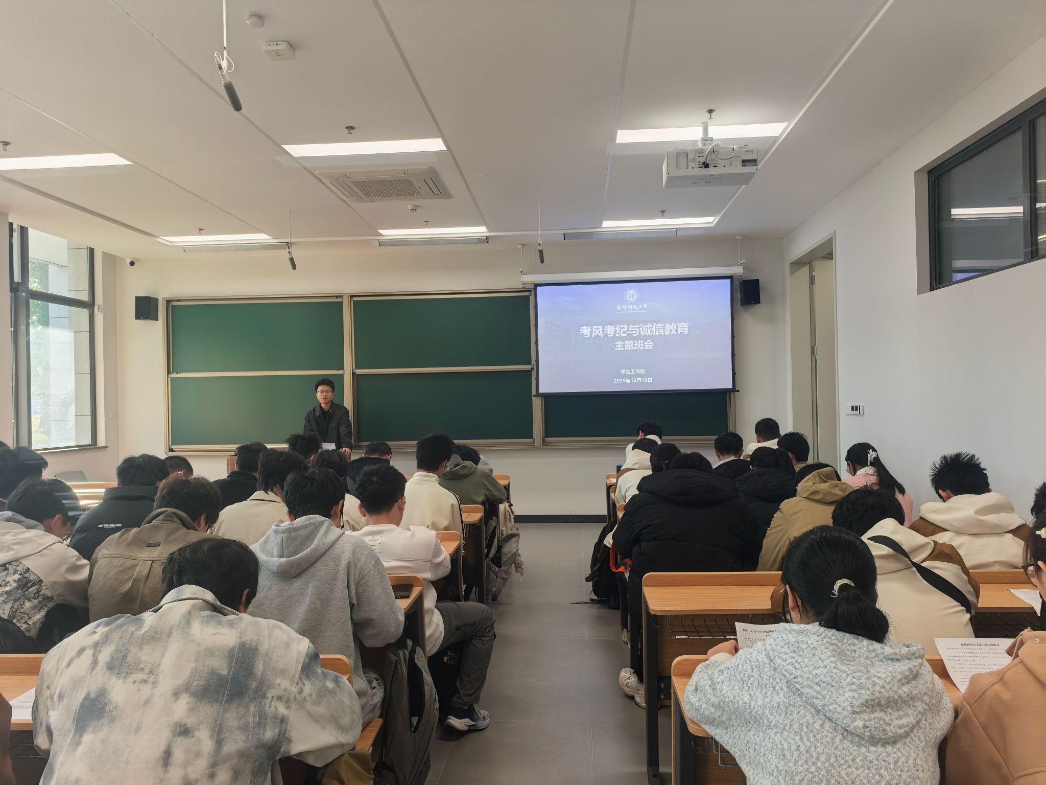 为深入贯彻落实立德树人根本任务,强化学生诚信意识,严肃考试纪律,营造公平、公正、健康的考试环境,2025年12月16日,学生工作处在旗山楼2-104教室组织召开“考风考纪与诚信教育”主题班会。本次班会面向全体学生,由2025级辅导员吴泓霖主讲,旨在通过系统解读规章制度与剖析真实案例,引导学生将“诚信应考”内化于心、外化于行。